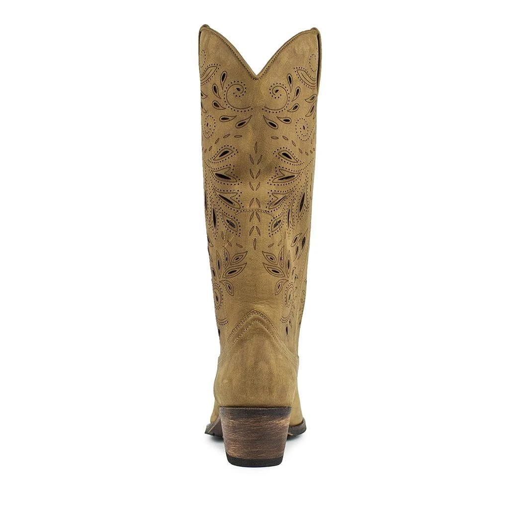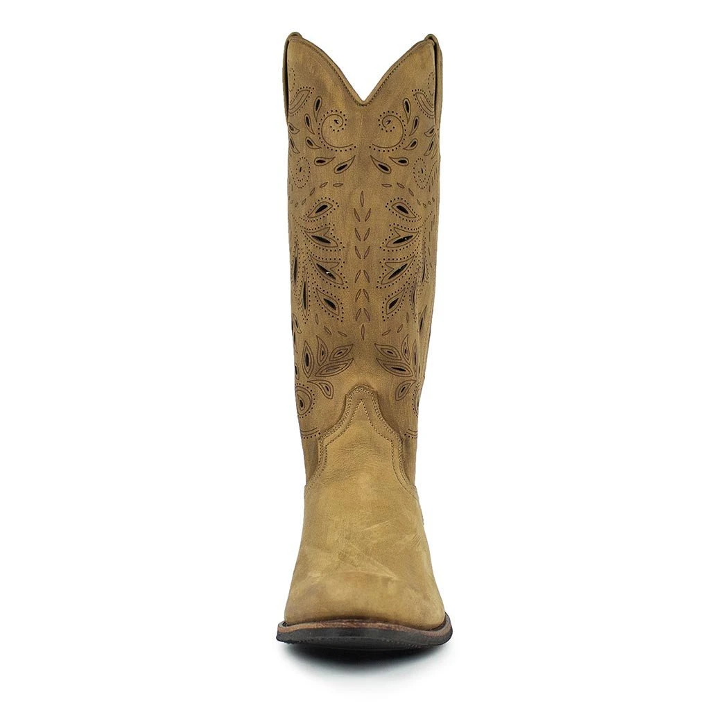 Bota de piel en color marrón con caña alta y diseño con calados y bordados en toda la caña. Cuenta con un tacón de 4,5 centímetros para una mayor comodidad a la hora de caminar pero al mismo tiempo realza tu belleza.