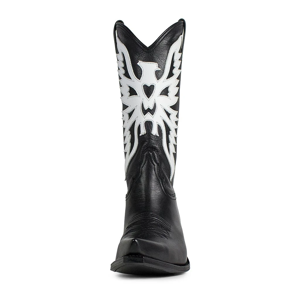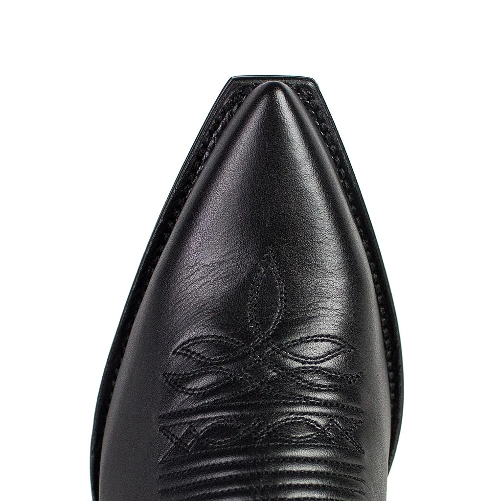 Bota en dos colores que destaca en su contraste y bordado en caña, estilo cowboy con horma cuervo y un tacón de 7,5cm semicubano.