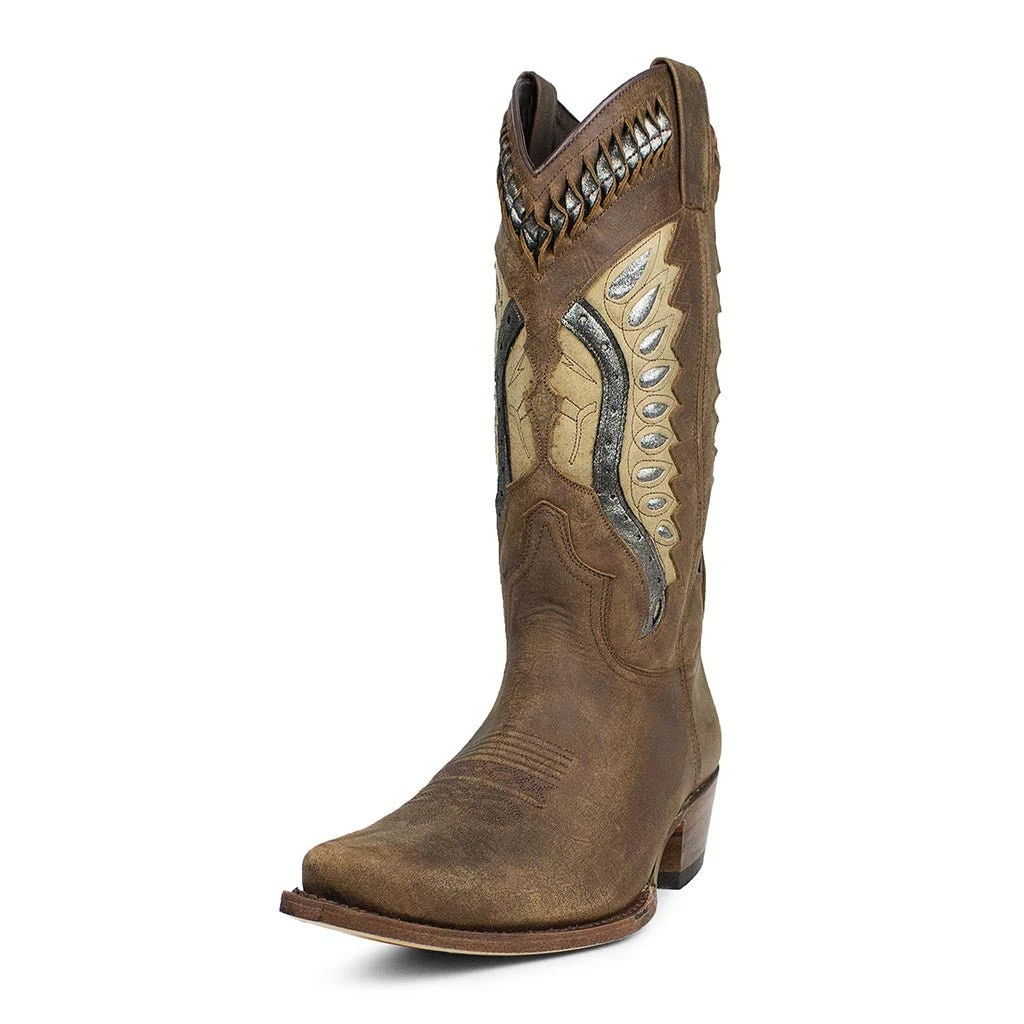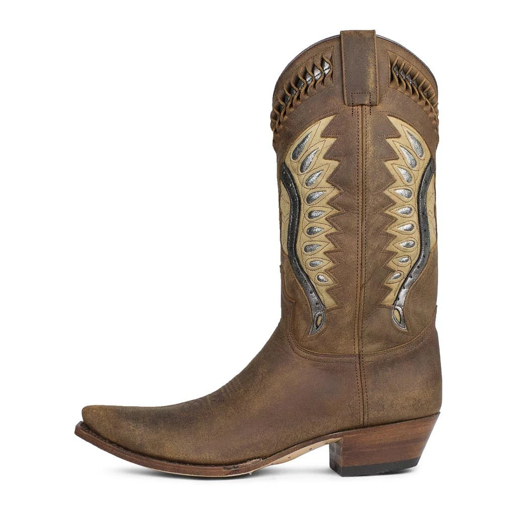 Maravillosa bota de color marrón engrasado con bordados en la caña y pespuntes en la punta. Punta puntiaguda y tacón cubano de 4,5 centímetros, para un estilo único.