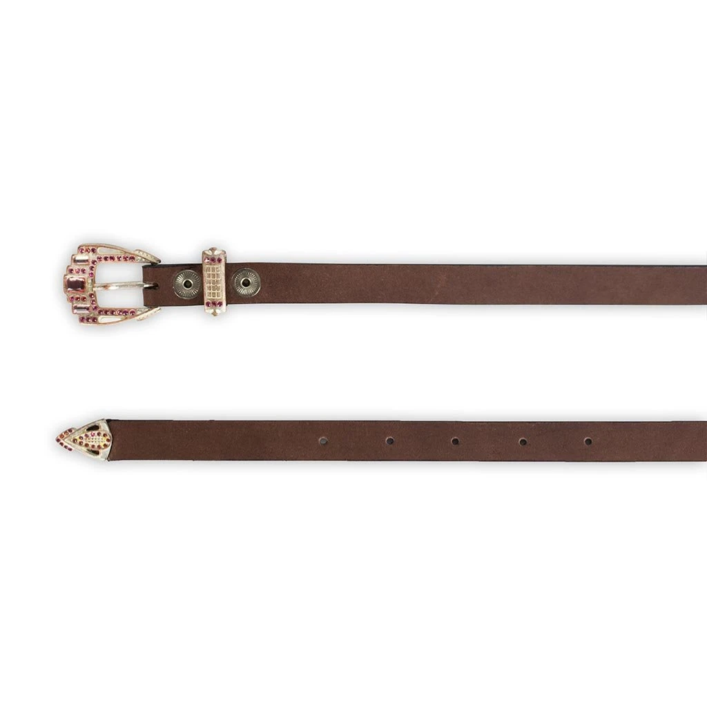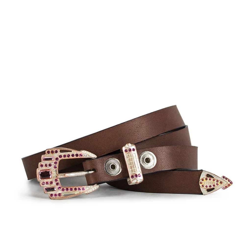 Cinturón de piel en color marrón y strass rosa en hebilla, con un grosor fino y elegante