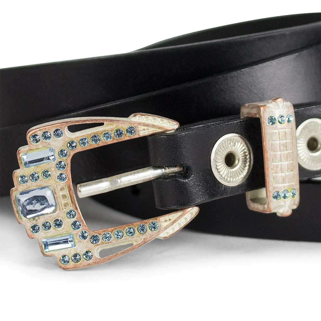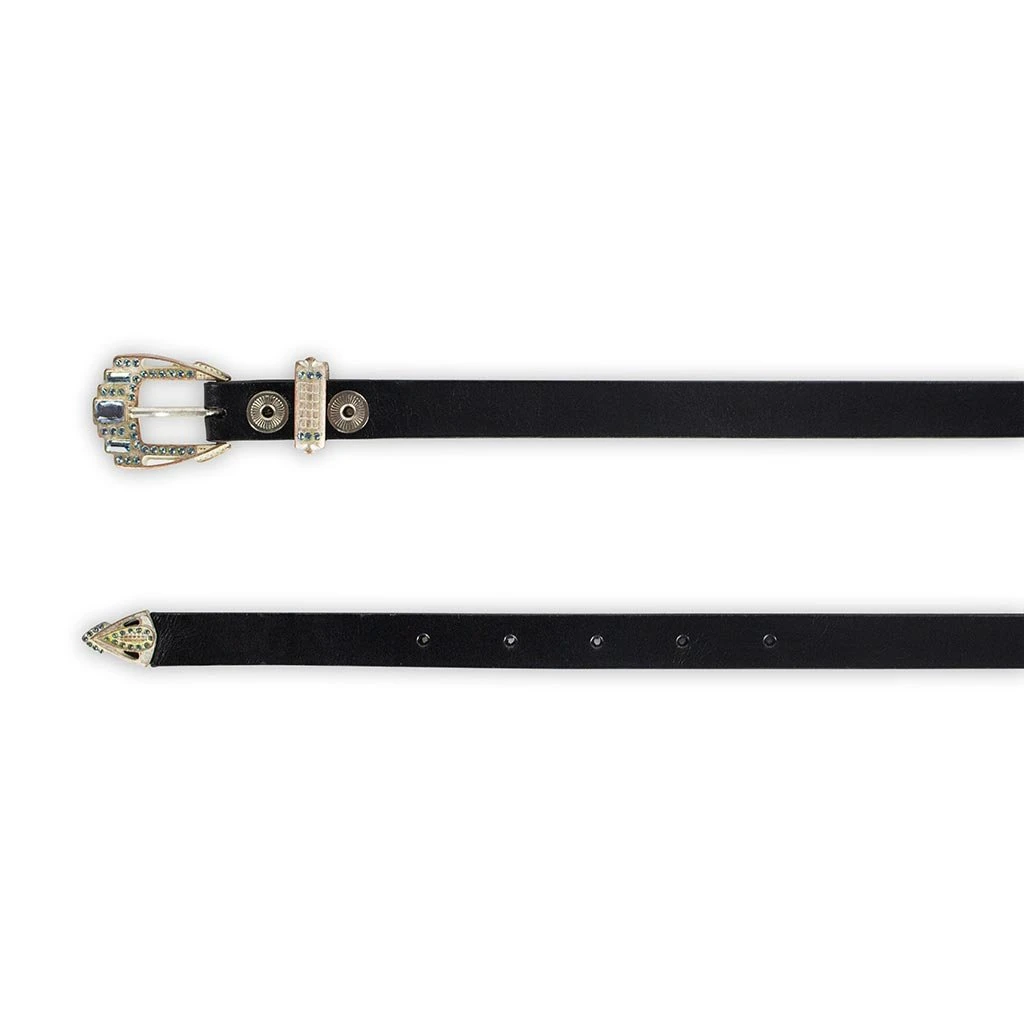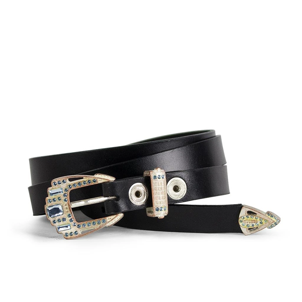Cinturón de piel negro con hebilla especial con strass, con un grosor fino y estilo muy femenino y delicado
