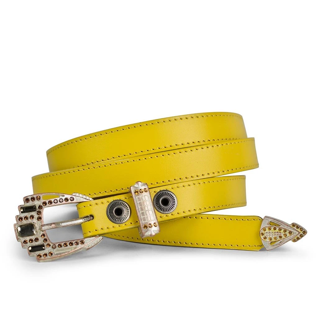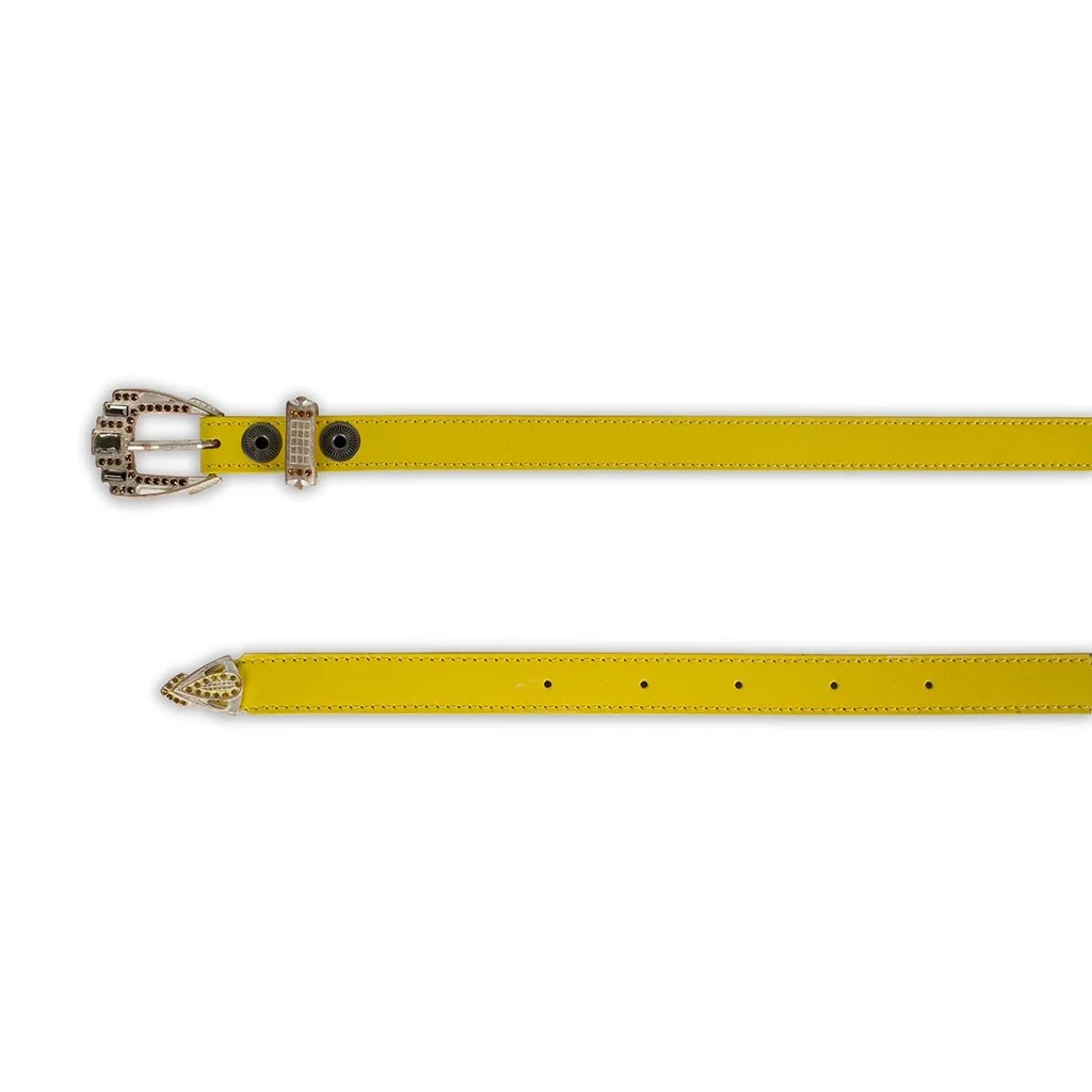 Cinturón de piel color amarillo con un grosor fino y elegante, con hebilla de diseño con strass.
