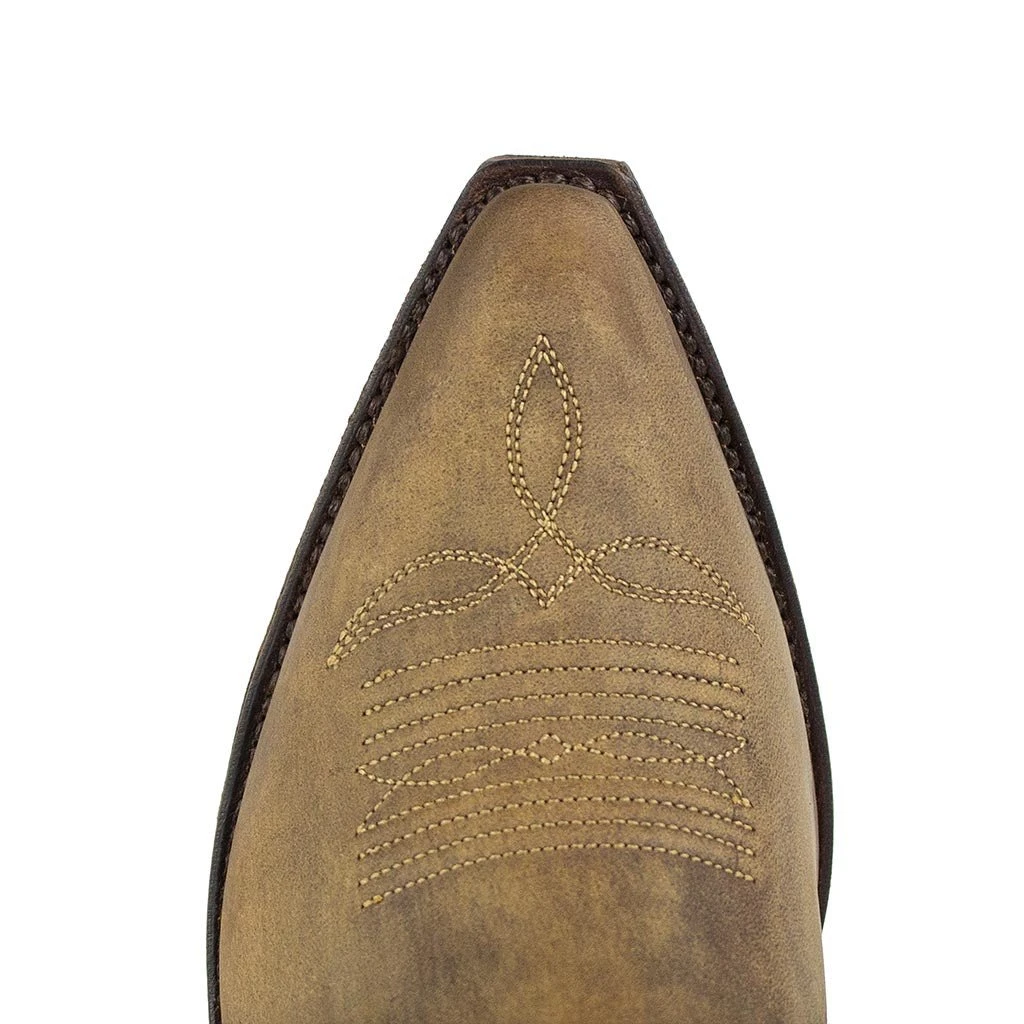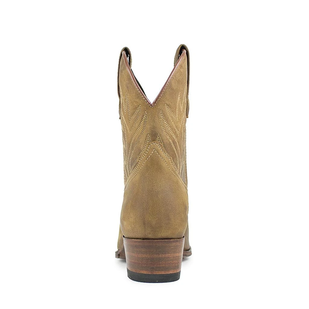 Increíble botín de Sendra, en piel marrón, ,4 cm de tacón, y suela de cuero, una altura perfecta de caña para falda o vestido, con bordados en la caña, y nuestro bordado clásico en el empeine.