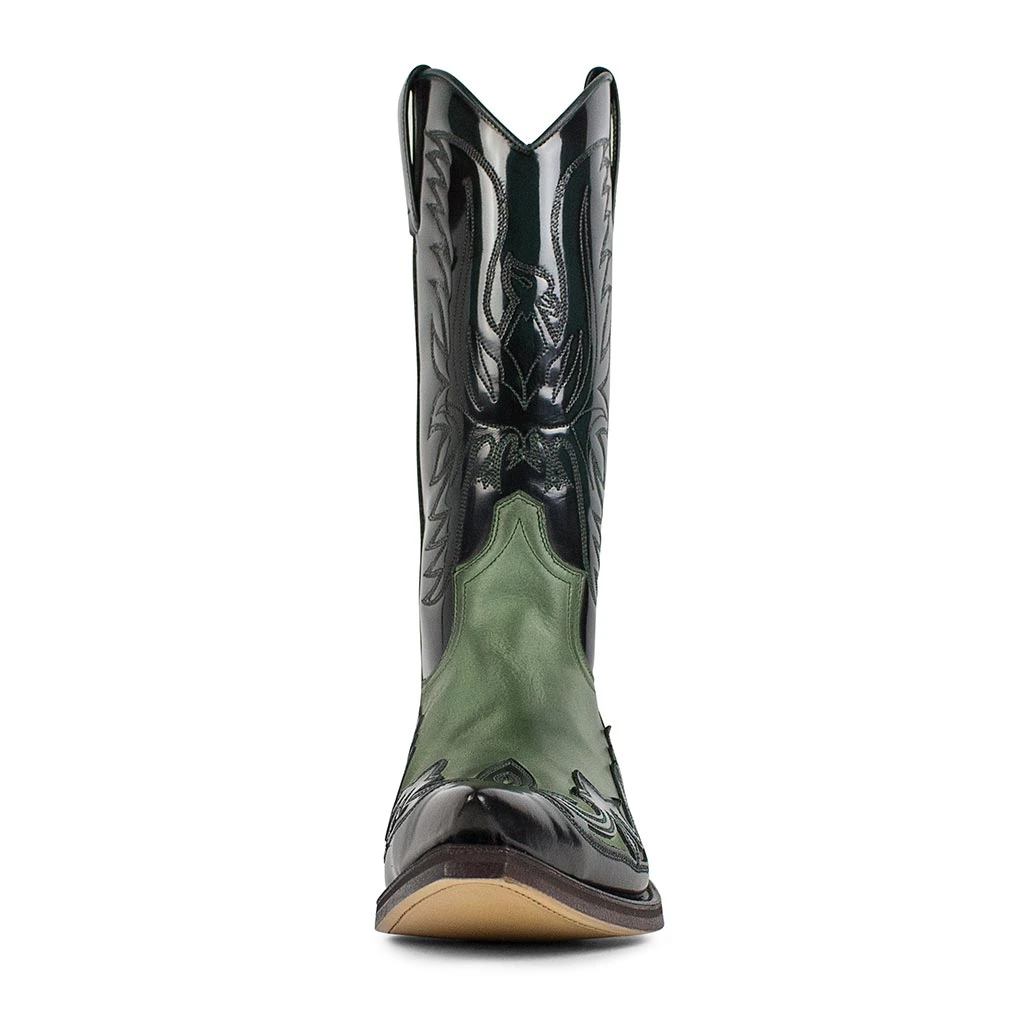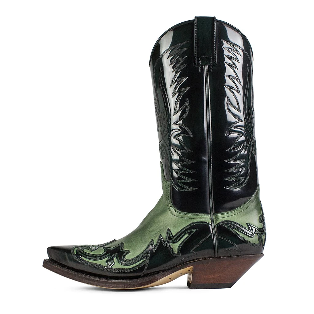Espectacular bota Cowboy de piel color negro brass y verde, con un recosido y bordado de diseño en caña realizado a mano y con materiales de alta calidad.