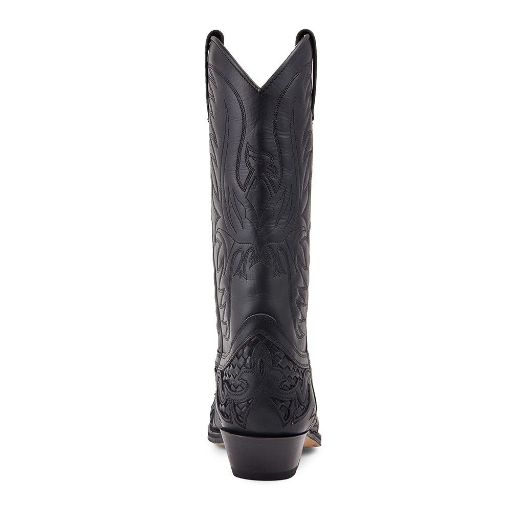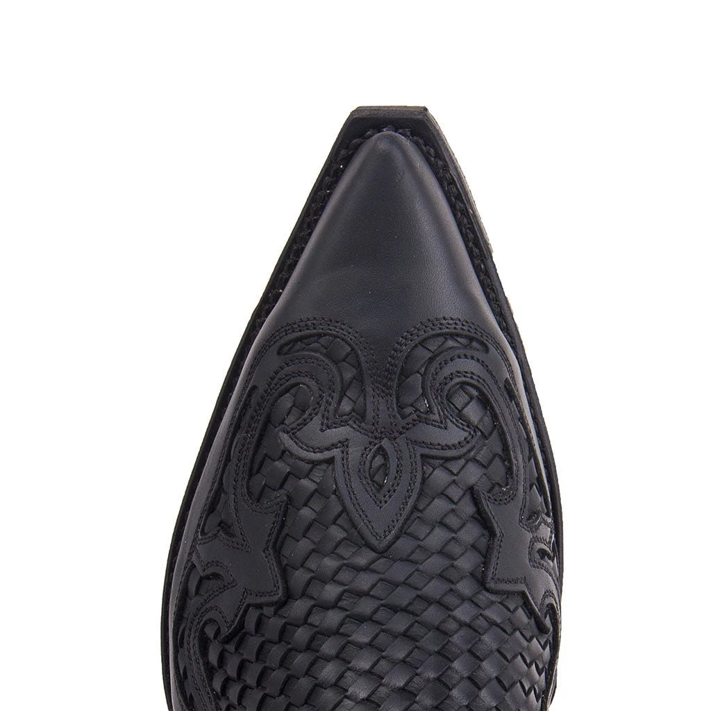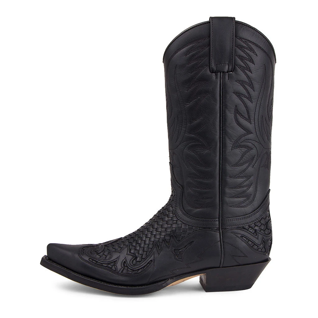 Bota de Sendra, estilo cowboy, uno de nuestros modelos referentes, de piel negra engrasada, trenzado en el empeine, horma en punta, tacón cubano, suela de cuero, fabricación GoodYear y nuestra garantía Sendra Boots.