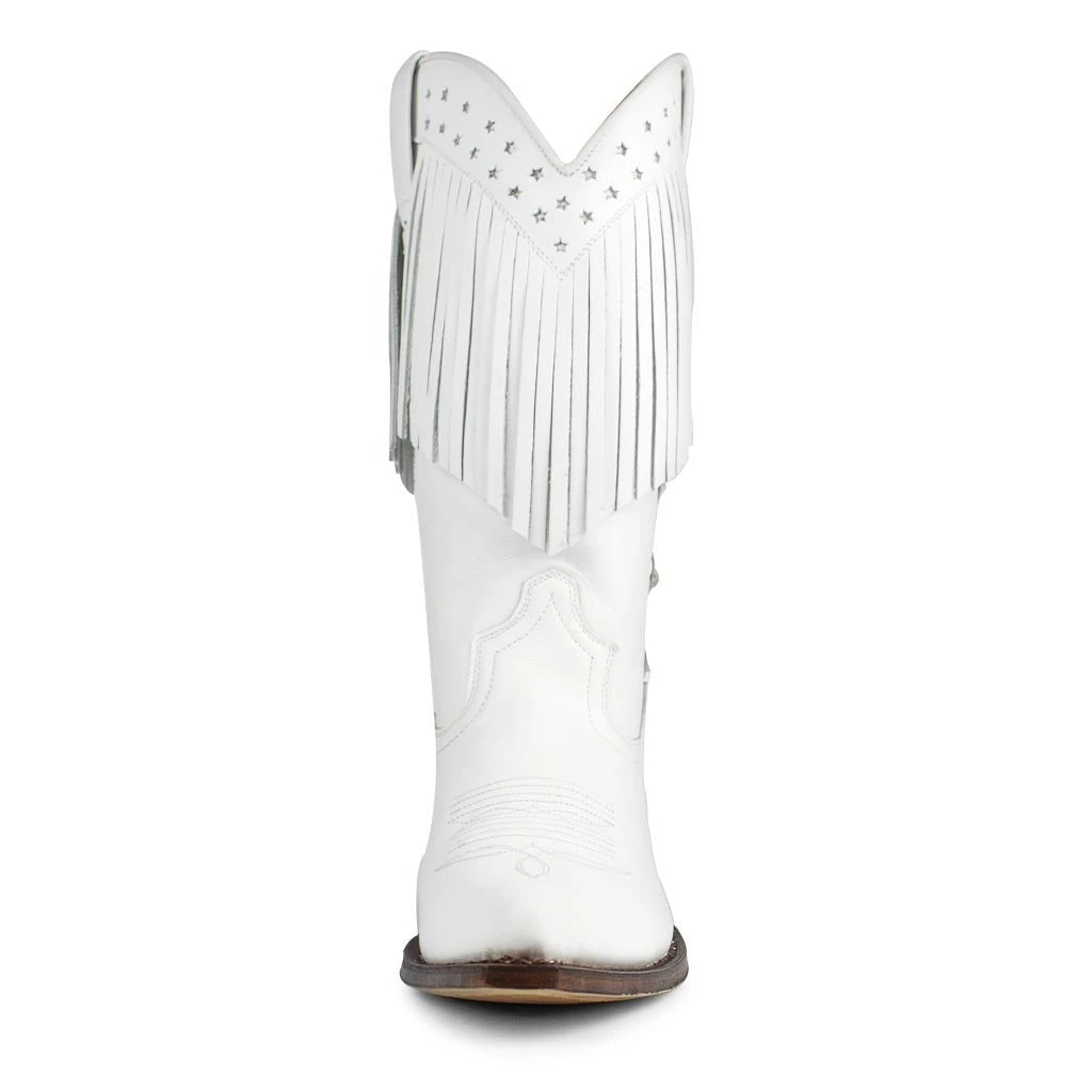 Maravillosa bota de color blanco con remaches en la caña y flecos rodeando la parte superior de la bota. Un tacón de 4,5 centímetros semicubano para un caminar mas cómodo.