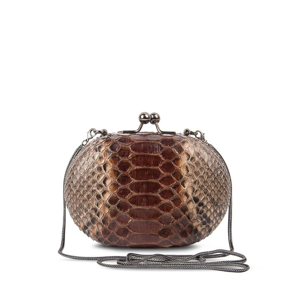 Bolso clutch de piel de python, con cadena fina de 63 cm, cierre con bandas rígidas que abarcan toda la boca del bolso y sendas esferas metálicas que se cruzan para cerrar el bolso. Interior con forro completo de piel. Con la calidad y garantía Sendra. Un bolso para llevar en la mano normalmente pero también puede llevarse con la cadena, para ir a una fiesta o para utilizar a diario.
