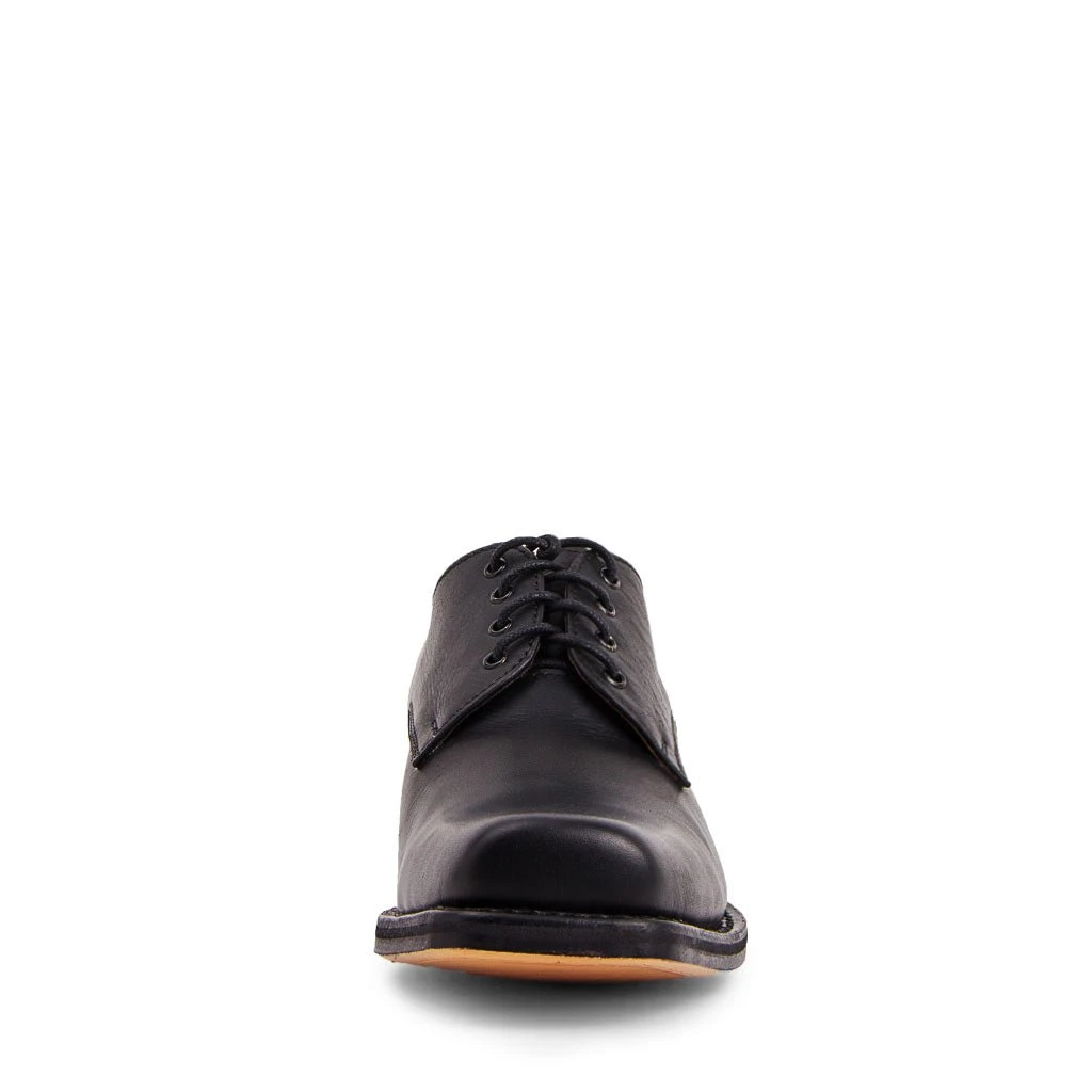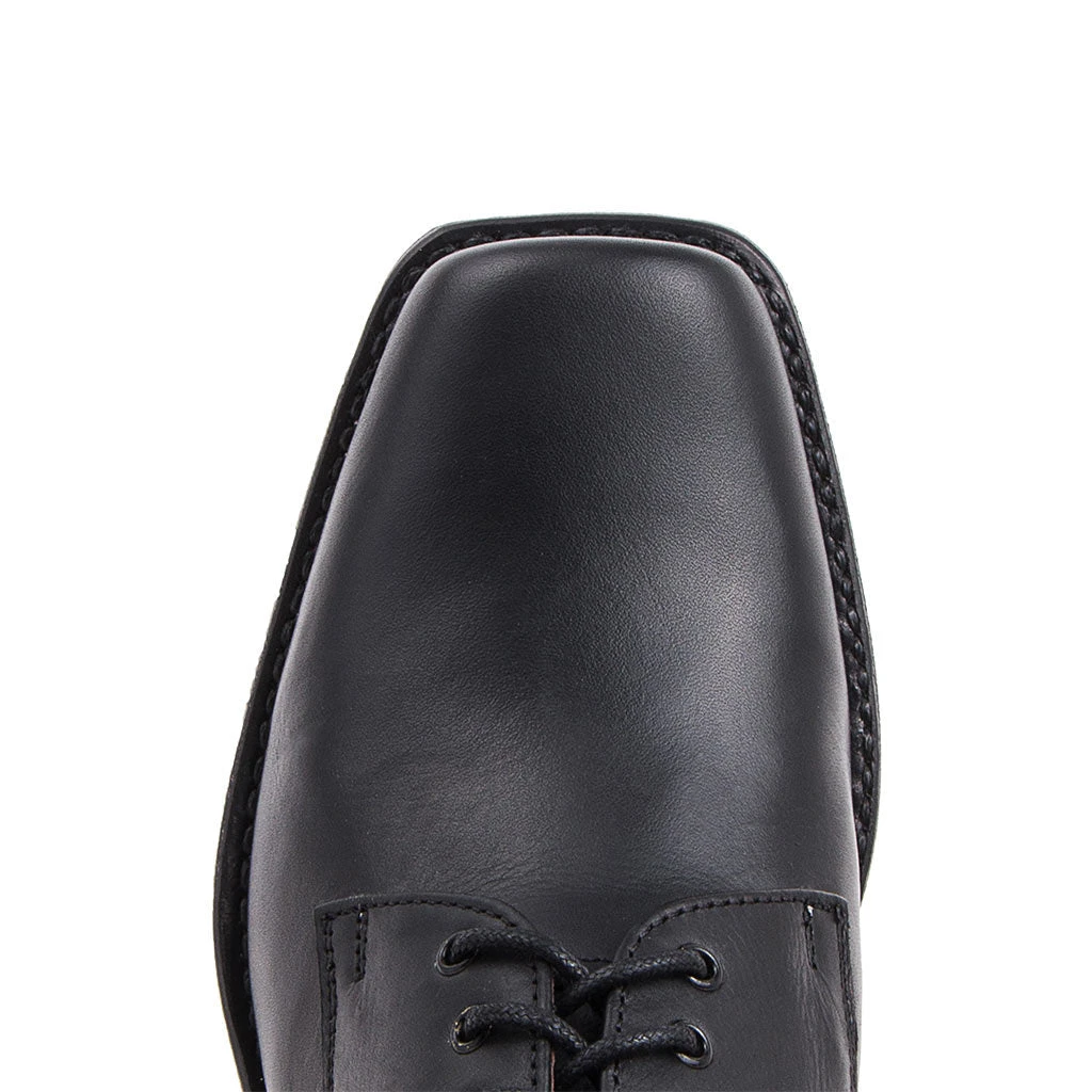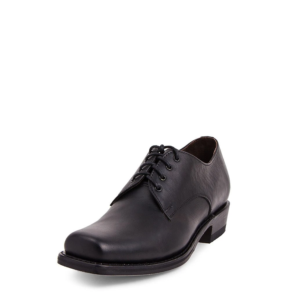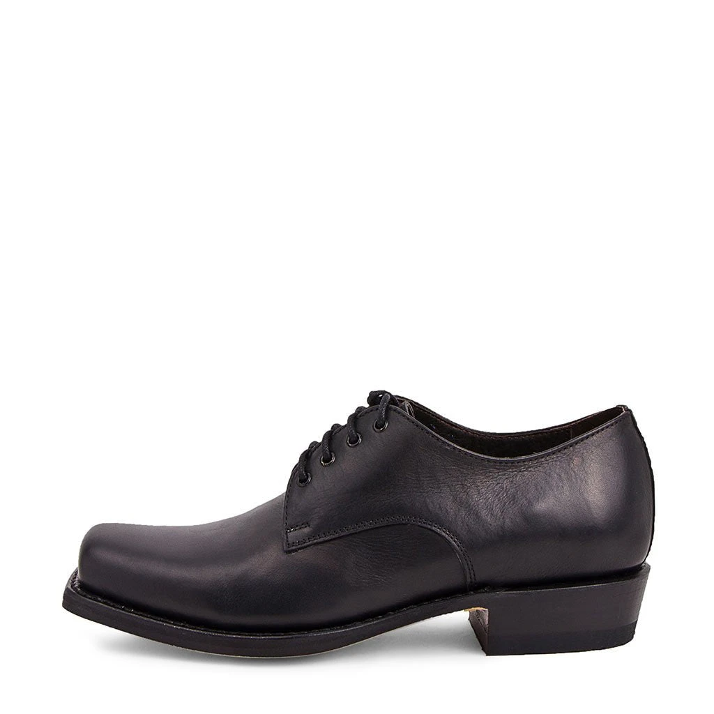 Zapato Sendra en piel negra,con tacón semicubano y horma cuadrada, el mismo efecto óptico que una bota biker pero con la comodidad de ser zapato, con suela de cuero y fabricación goodyear.