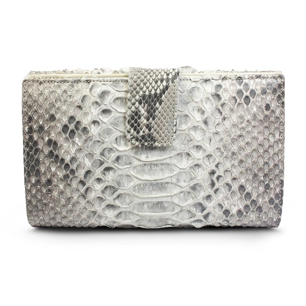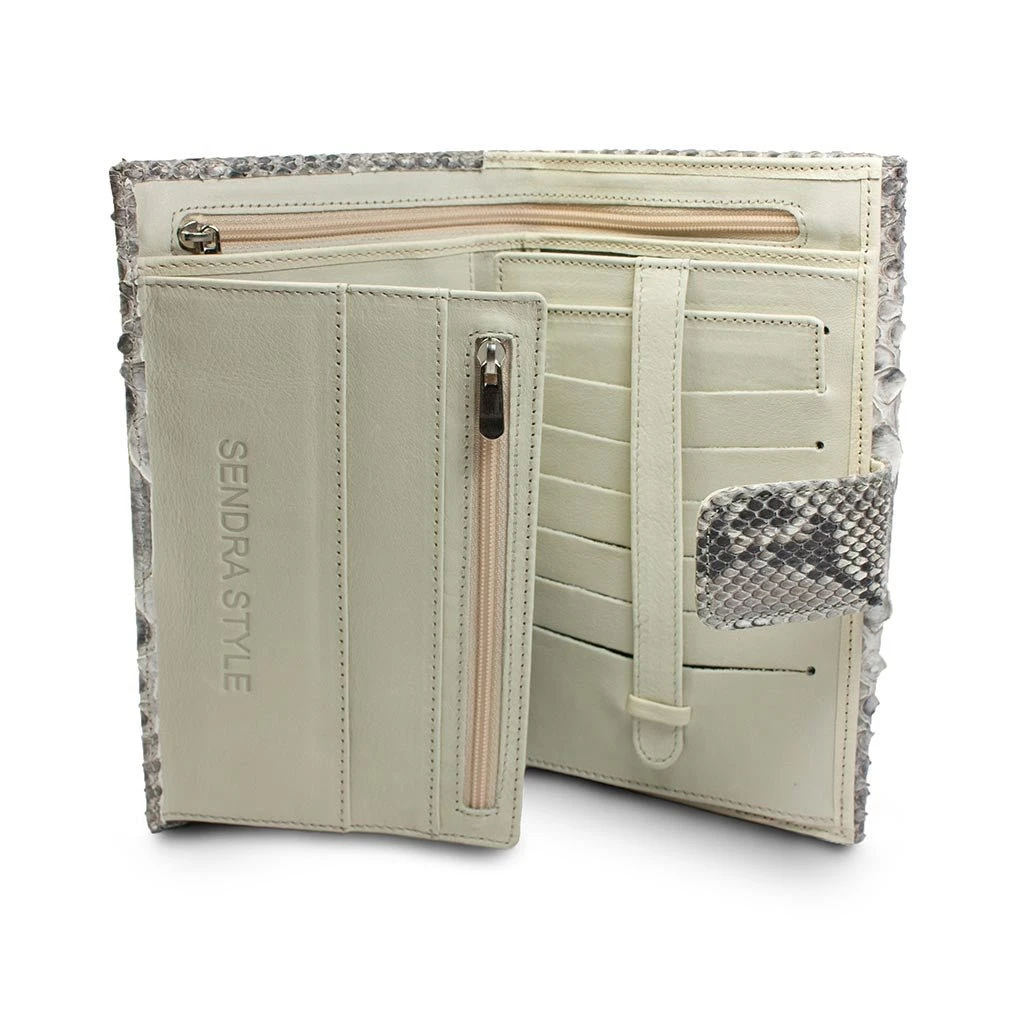 Cartera de piel escamada blanca con cierre de broche. Espacio para organizar todo tipo de tarjetas y efectivo.