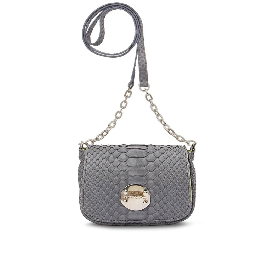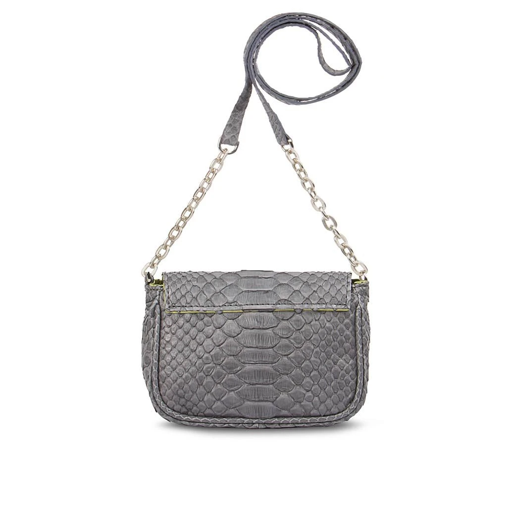 Bolso de piel escamada color gris con asa unida con cadenas.