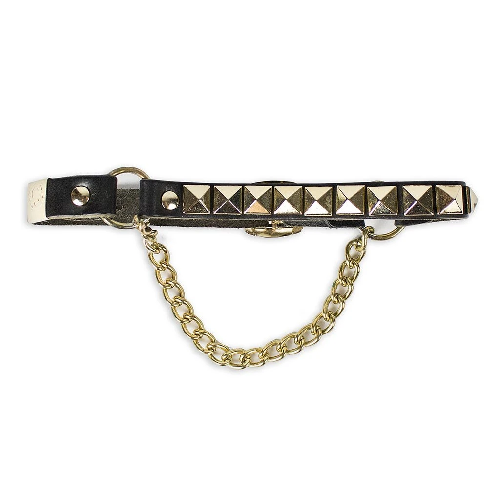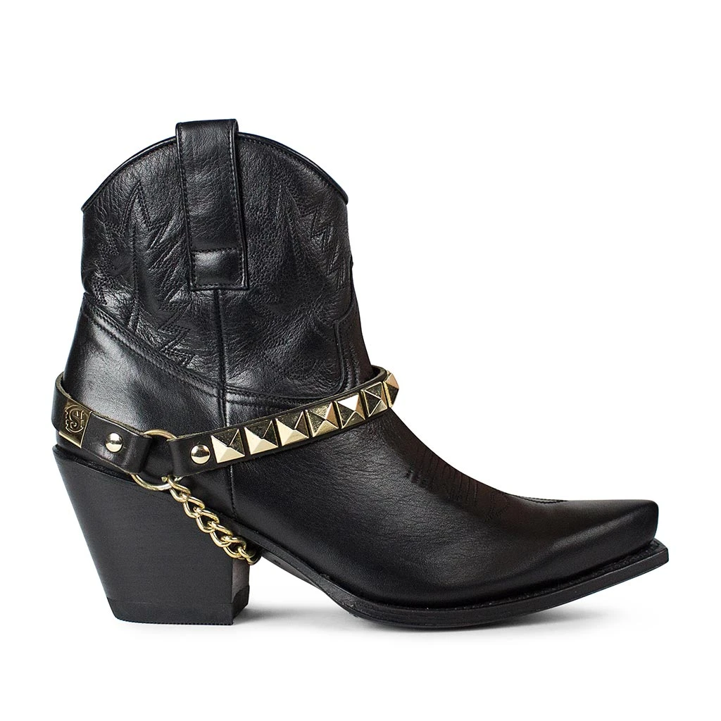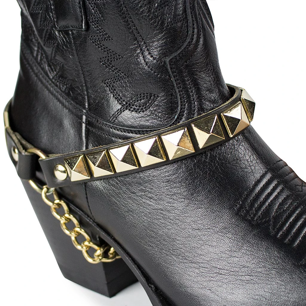 Arnes diseñado en piel de alta calidad y se caracteriza por sus tachas en color dorado en contraste con el fondo negro, permitiendo un diseño atractivo con un ajuste perfecto a tu bota. ¡Un detalle a tener en cuenta!