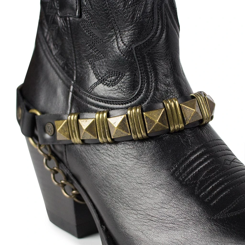 Este arnés con tachas en color oro viejo y cadena, ofrece un toque de elegancia a un clásico. El color negro y la calidad de la piel aseguran durabilidad y resistencia, para usar a diario. El Arnes 31 es un diseño versátil ideal para añadir a tus botas y estilos a tus looks.