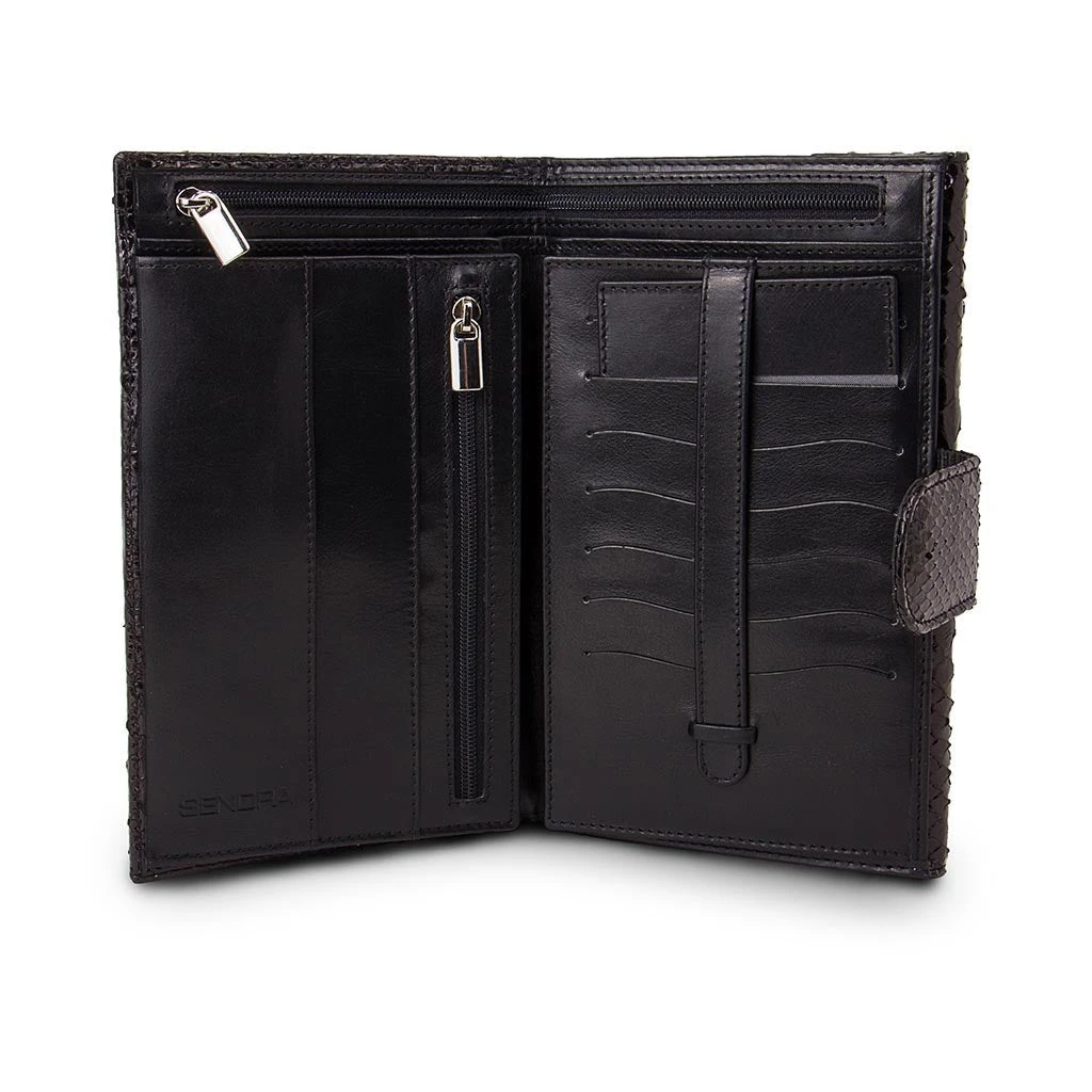 Cartera negra de piel escamada con espacio para poder organizar todo lo que quieras.