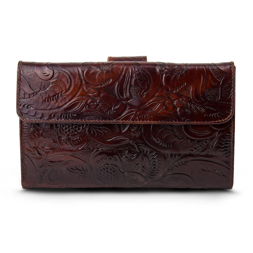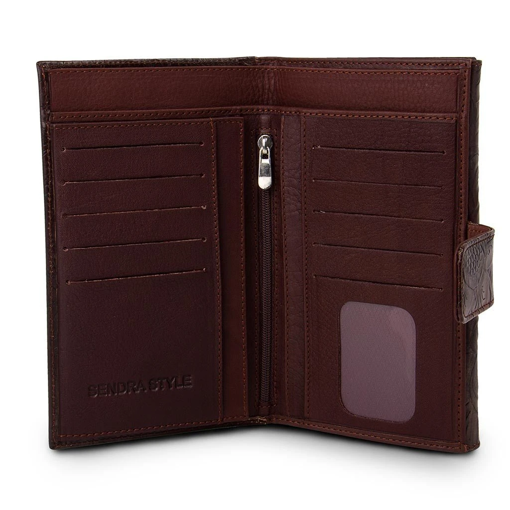 Cartera Sendra de mujer de piel marrón cincelada a mano , forma rectangular. Interior con diversas ranuras para tarjetas y billetes, y bolsillo monedero exterior con fuelle con la garantía Sendra.